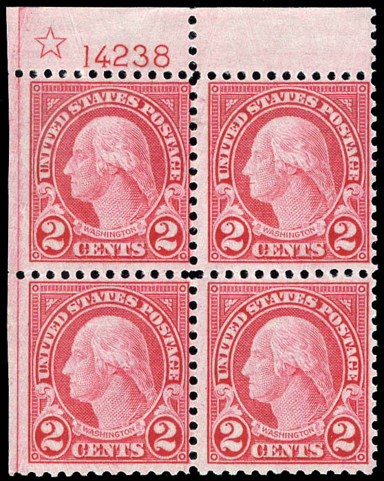 1923, 2¢ Washington, rotary press coil waste, perf. 11 (Scott 595), plate block of 4, o.g., never hinged, Fine. Scott $2,900.