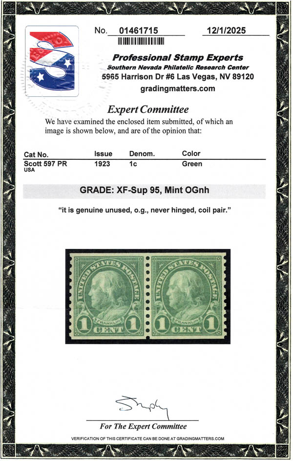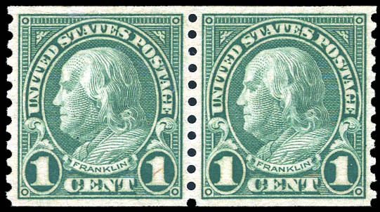 Lot 917![]() ![]() 1923, 1¢ Franklin, rotary press coil, perf. 10 vertically (Scott 597), a well centered pair, o.g., never hinged, Extremely Fine to Superb, with 2025 P.S.E. certificate graded XF-SUP 95. SMQ $120. Estimate $80 - 120. |
