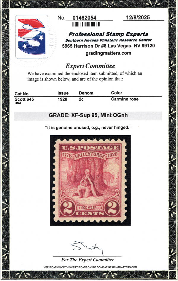 1928, 2¢ Valley Forge (Scott 645), deep "lake like" color, o.g., never hinged, Extremely Fine to Superb, with 2025 P.S.E. certificate graded XF-SUP 95. SMQ $95.