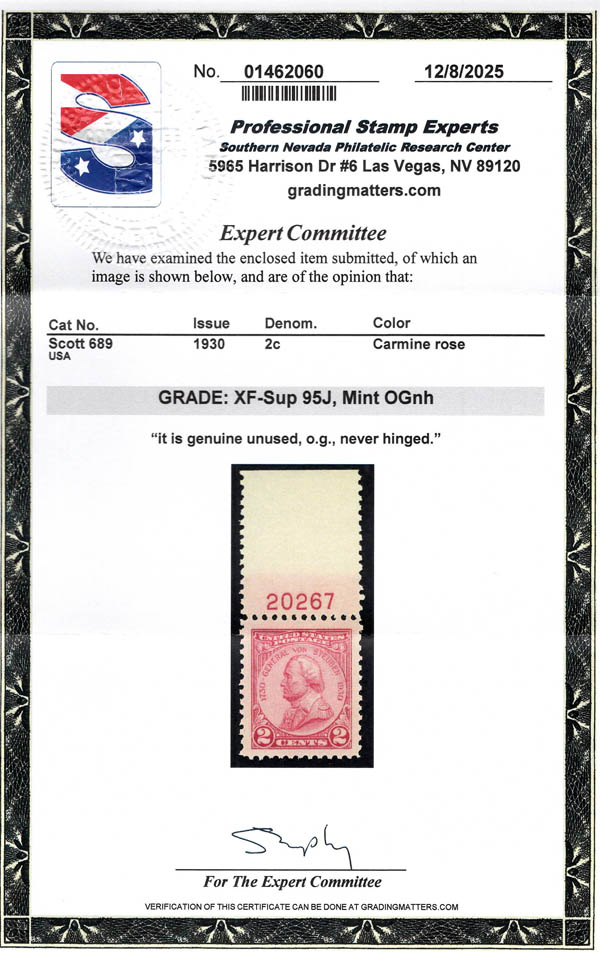 1930, 2¢ Von Steuben (Scott 689), a beautiful plate number single, o.g., never hinged, Extremely Fine to Superb, with 2025 P.S.E. certificate graded XF-SUP 95J. Scott $1. SMQ $110.
