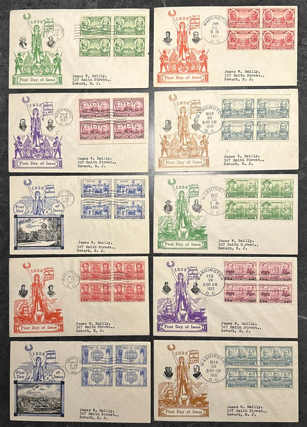 1936-37, Army-Navy complete (Scott 785-794), on matching set of cacheted First Day Covers, Very Fine to Extremely Fine. Scott $85.