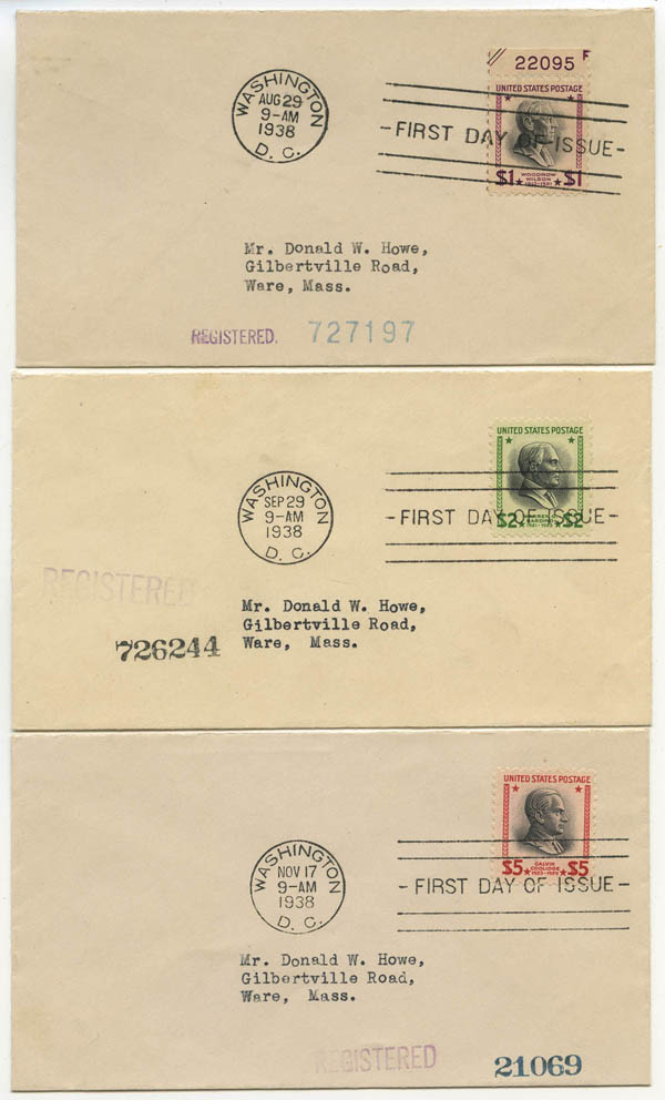 Lot 960![]() 1938, Presidential Issue, ½¢ to $5 complete, FDC's (Scott 803-834), a matching set of 33, each with printed address of Adam K. Bert on the back flap, all neat and clean (the 30¢ is slightly toned), uncacheted, with typewritten addresses, mostly Very Fine. Scott $581. Estimate $150 - 200. |