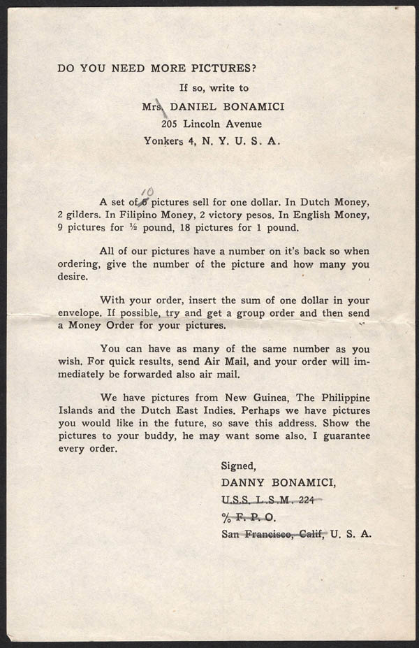 Lot 963![]() 1938, Presidential Issue, 24¢ Benjamin Harrison (Scott 828), single franking on a triple weight airmail cover in 1945; contents are included along with the photos which are mentioned in the content; a neat correspondence between family members just before the end of WWII, offering photos presumably from the war, Very Fine. Scott $175. Estimate $300 - 400. |