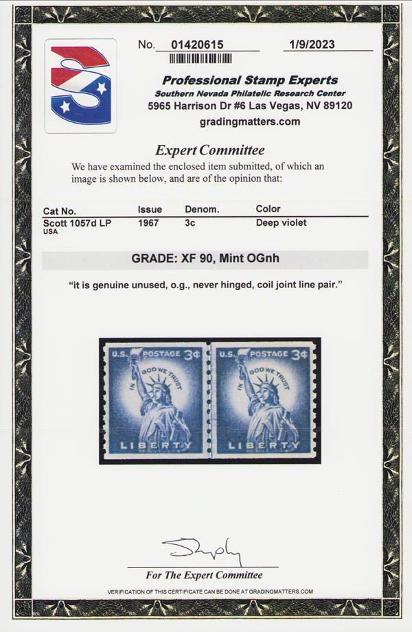 Lot 989![]() ![]() 1967, Liberty Issue, 3¢ Statue of Liberty, horizontal coil, tagged, philatelic printing (Scott 1057d), line pair, o.g., never hinged, Extremely Fine, with 2023 P.S.E. certificate graded XF 90. SMQ $75. Estimate $75 - 100. |