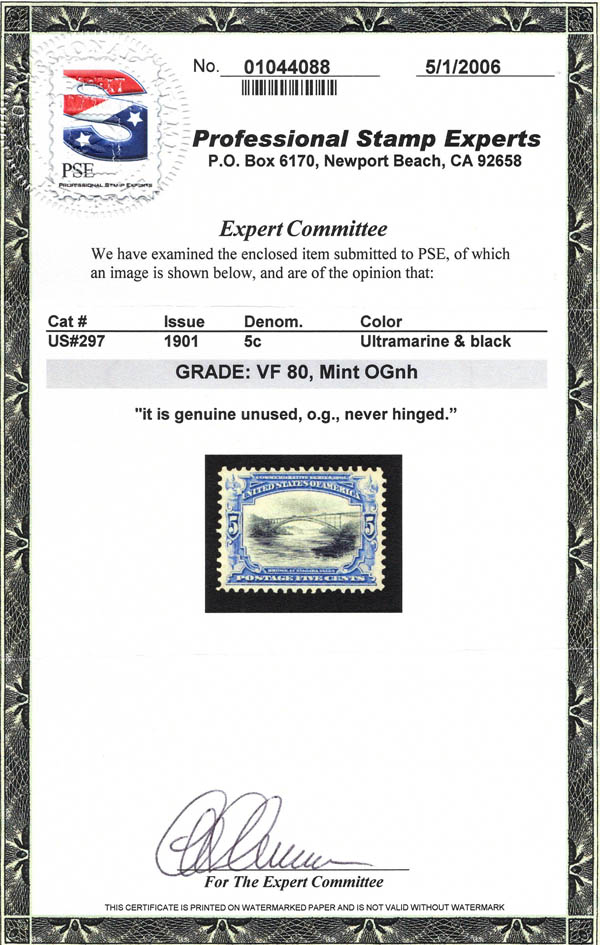 1901, 5¢ Pan-American (Scott 297), rich color and impression, o.g., never hinged, Very Fine, with 2006 P.S.E. certificate graded VF 80. Scott $180.