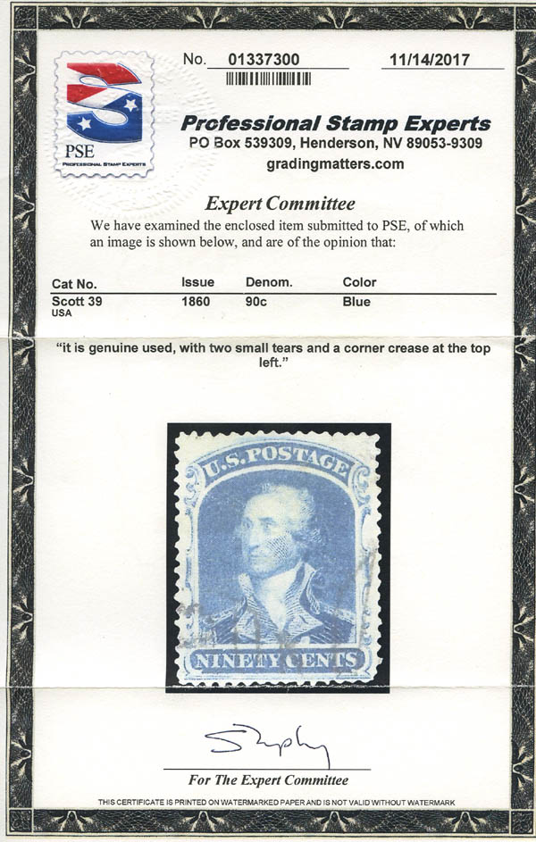1860, 90¢ Washington, blue (Scott 39), Prachtstück im Aussehen, an attractive example of this classic high value, which is very rare genuinely used. Scott $10,000.