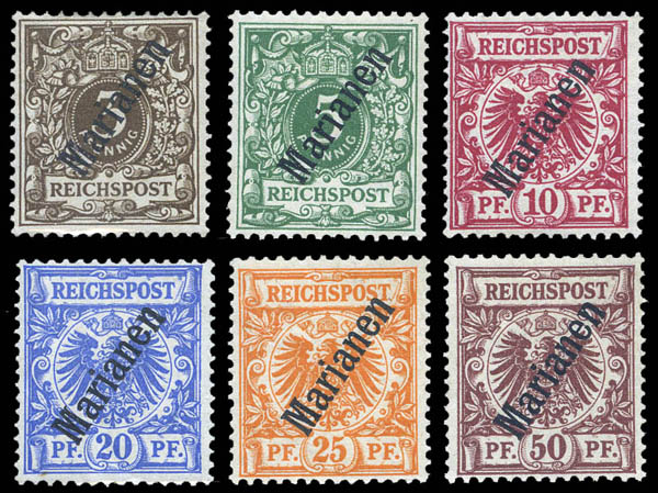 German Colonies: Mariana Islands, 1900, Crowned Eagle, 3pf to 50pf complete, 56 degree overprints (Michel 1-6 II. Scott 11-16), set of 6, Feinst. Michel €230 ($250). Scott $188.