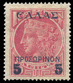Los 102![]() Greece: Crete, 1909, Hera, 5L on 20L carmine rose (Scott 97. Michel 46 F), Feinst. The lot also includes 6 other surcharged values from this series (catalog value $9). Scott $230. Michel €150 ($160). Estimate $60 - 80. |