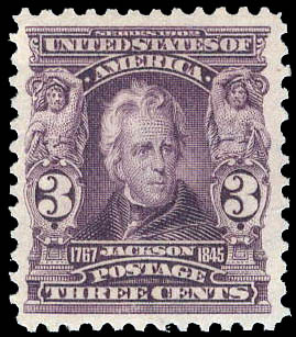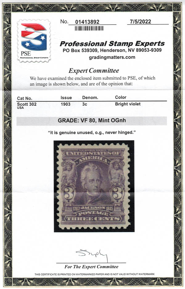 1903, 3¢ Jackson, bright violet (Scott 302), VF 80. Scott $140. SMQ $130.