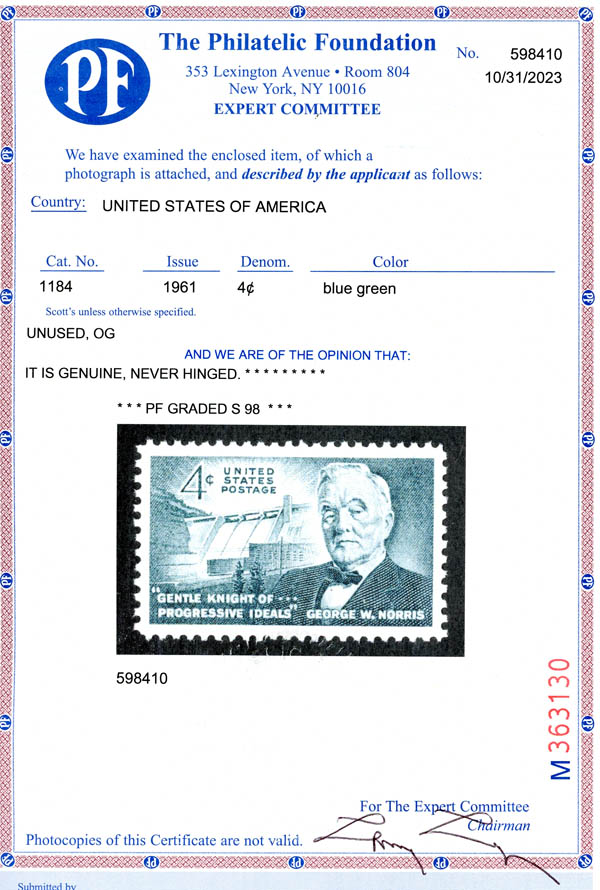 1961, 4¢ George Norris (Scott 1184), Luxus. SMQ $60.