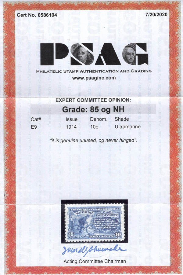 Special Delivery, 1914, 10¢ ultramarine (Scott E9), VF-XF 85. Looks more like a 90 to us! Scott $425. SMQ $575. Scott Stamp Values $500.
