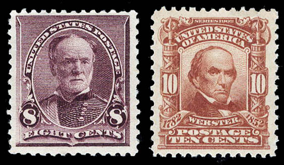 1893, 8¢ Sherman and 1903, 10¢ Webster (Scott 225, 307), Pracht. Scott $105.