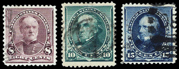 1890-93, 8¢ Sherman, 10¢ Webster, and 15¢ Clay (Scott 225-227), very fine to extremely fine. Scott $50.