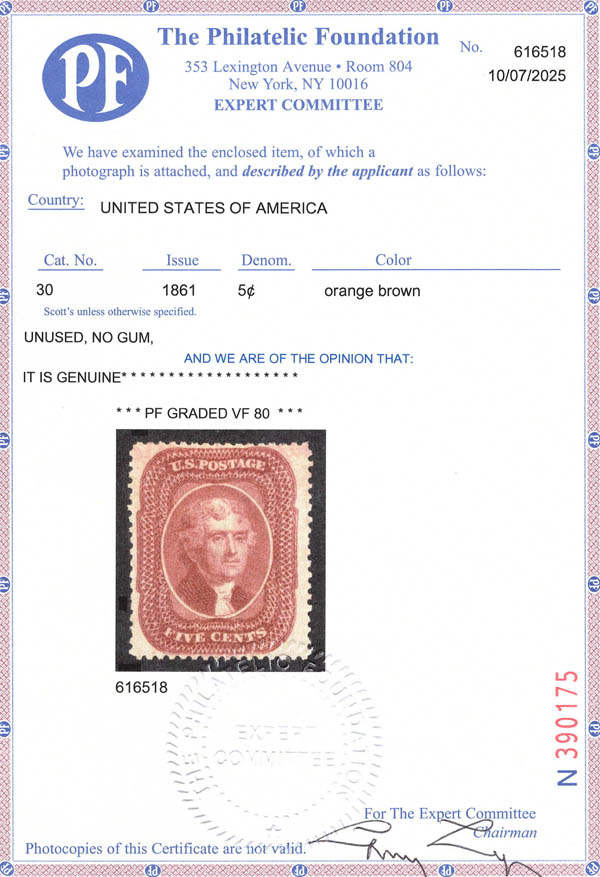 1861, 5¢ Jefferson, orange brown, type II (Scott 30), VF 80. Scott $575.