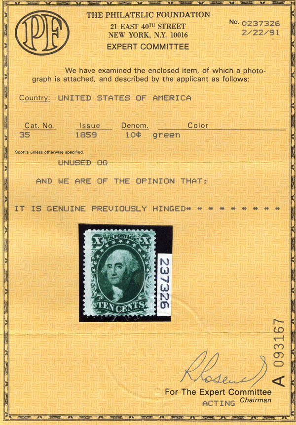 1859, 10¢ Washington, green, type V (Scott 35), very fine to extremely fine. Scott $210.
