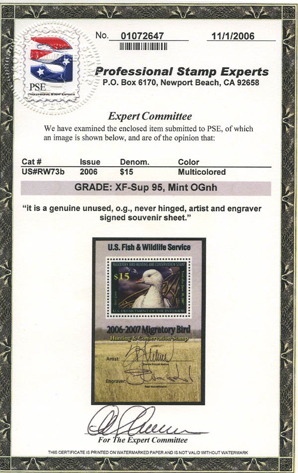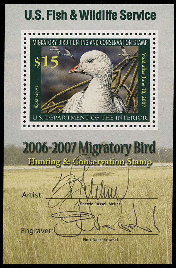 Federal Duck Stamp, 2006, $15 Ross's Goose, souvenir sheet of 1 (Scott RW73b), signed by the artist and by the engraver, XF-SUP 95. Scott $95. SMQ $225.