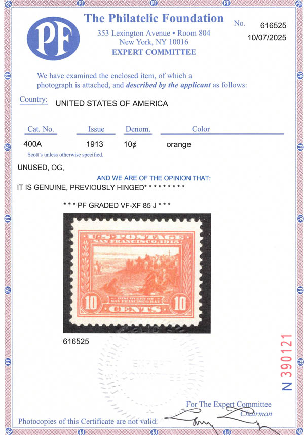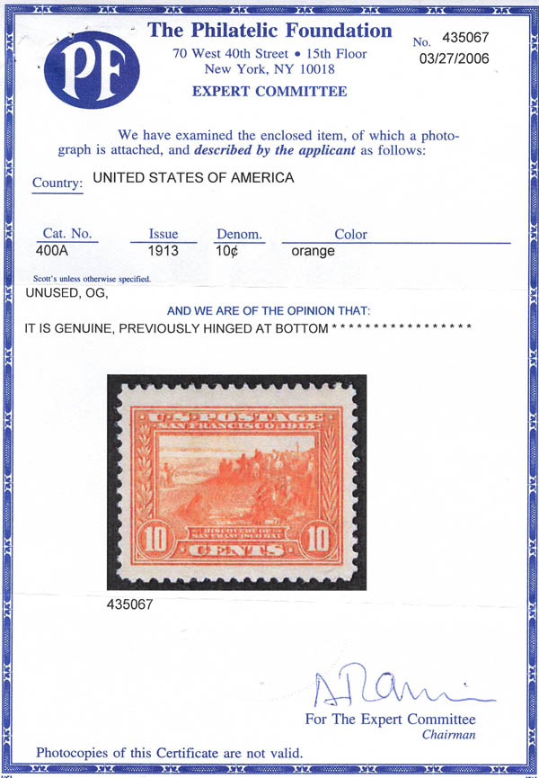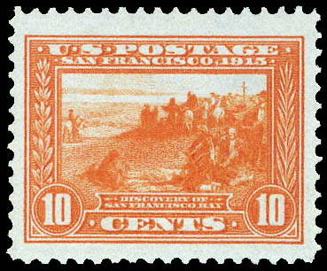 1913, 10¢ Panama-Pacific, perf. 12, orange (Scott 400A), VF-XF 85 J. Scott $175. SMQ $270.