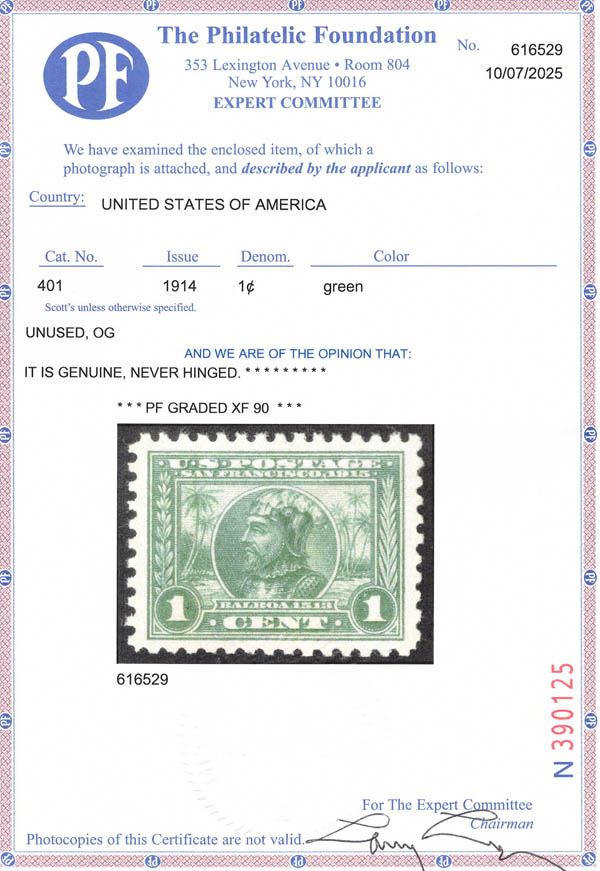 1914, 1¢ Panama-Pacific, perf. 10 (Scott 401), XF 90. Scott $60. Scott Stamp Values $125. SMQ $125.