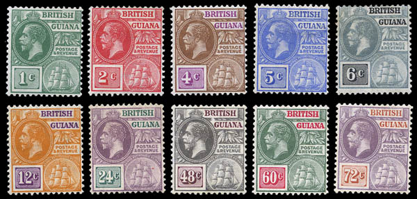British Guiana, 1913-21, King George V, 1¢ to 96¢ complete, Multiple Crown CA watermark (SG 259/269a, 269b. Scott 178-189), set of 12, Feinst. SG £142 ($180). Scott $193.