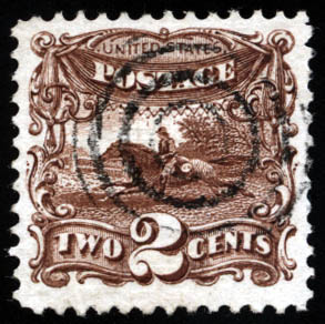 1869, 2¢ brown (Scott 113), well centered within large margins with excellent color, neat target cancel; shorter perfs at right, Very Fine.