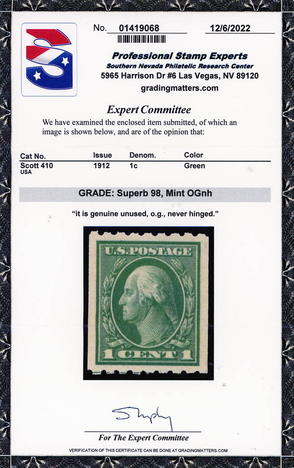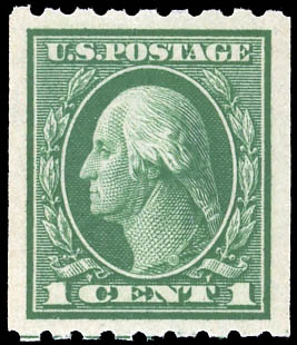1912, 1¢ Washington, green, S.L. watermark, vertical coil, perf. 12 horizontally (Scott 410), SUP 98. SMQ $250.