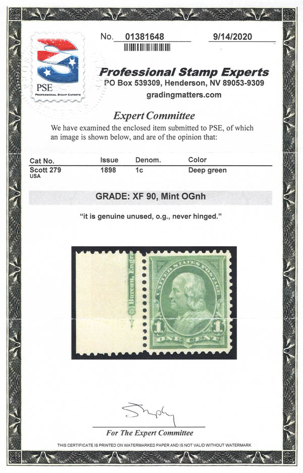 1898, 1¢ Franklin, deep green (Scott 279), XF 90. Scott $25. SMQ $100.
