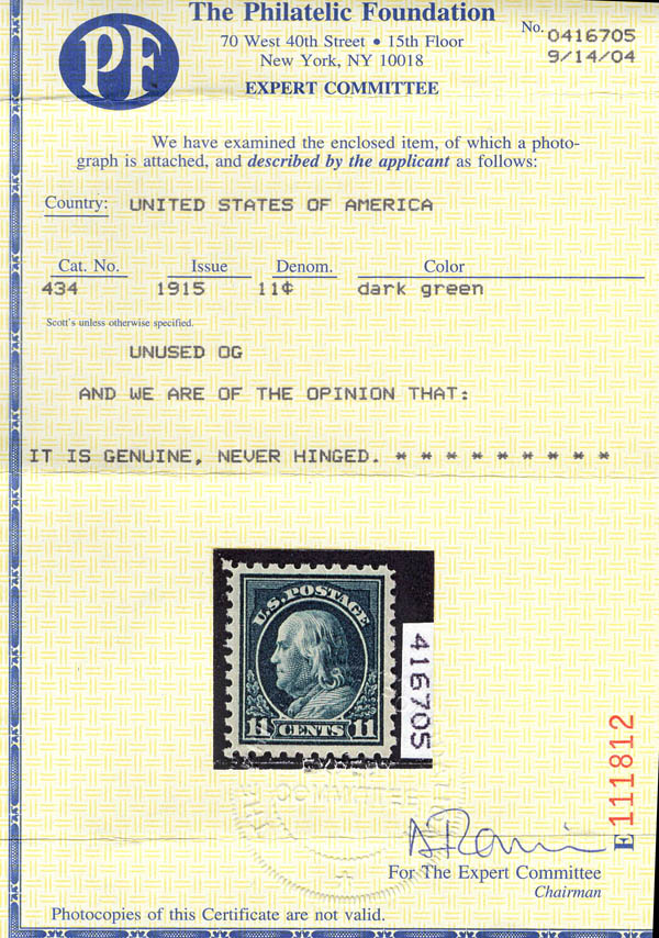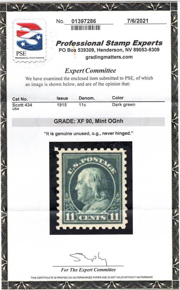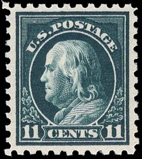 1915, 11¢ Franklin, dark green, S.L. watermark, perf. 10 (Scott 434), XF 90. Scott $75. SMQ $125.