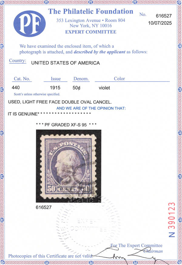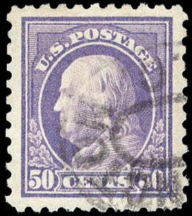 1915, 50¢ Franklin, violet, S.L. watermark, perf. 10 (Scott 440), XF-SUP 95. Scott $20. Scott Stamp Values $250. SMQ $275.