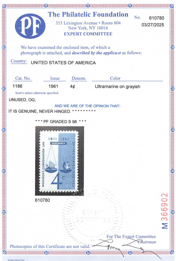 1961, 4¢ Workmen's Compensation (Scott 1186), SUP 98. SMQ $70.