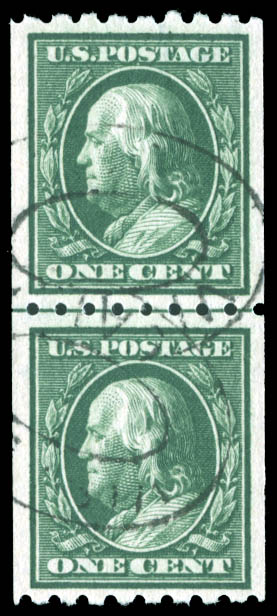 1910, 1¢ Franklin, S.L. watermark, vertical coil (Scott 390), extremely fine to superb. Scott $125.