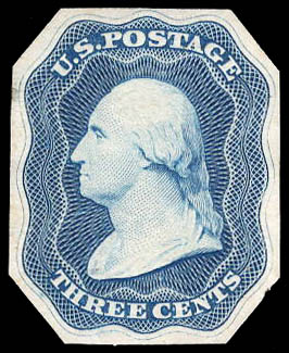 1851, 3¢ Washington essay, by Danforth, Bald & Co., in blue (Scott 11-E12d. Brazer 33E-Jd), die on ivory glazed paper, sonst Fein. Scott $750.
