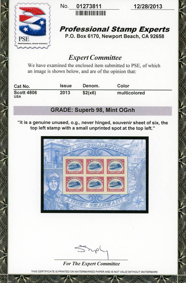 2013, Inverted Jenny, miniature sheet of 6 (Scott 4806), SUP 98. SMQ $125.