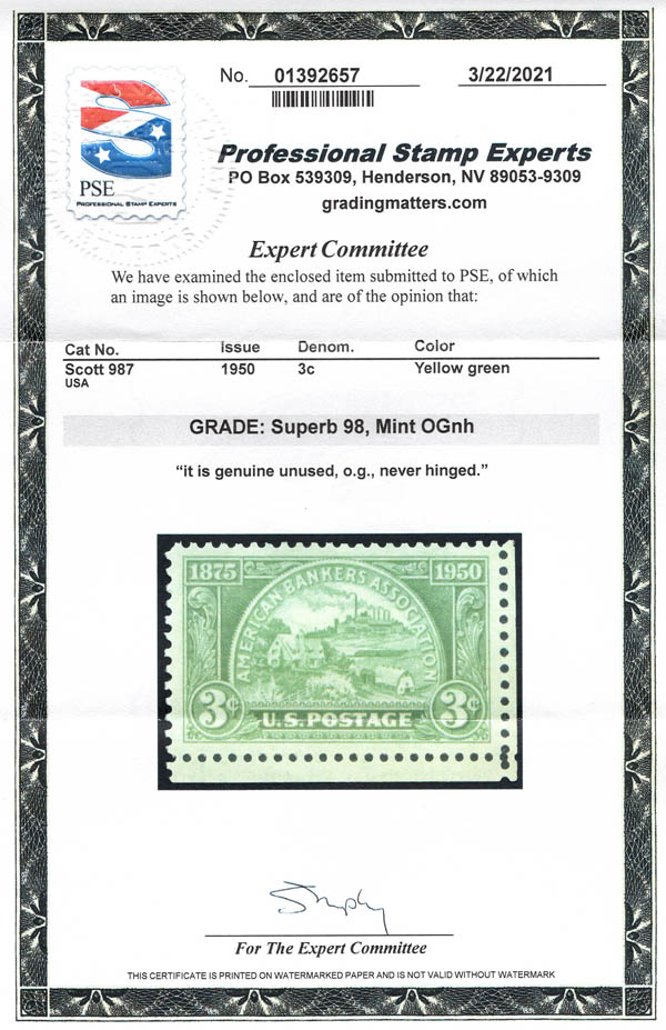 1950, 3¢ American Bankers Association (Scott 987), Luxus. SMQ $50.