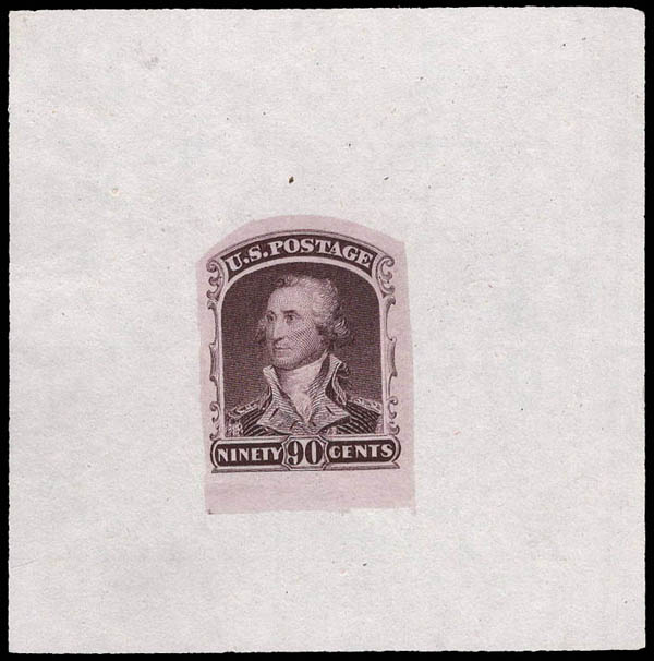 1861, 90¢ Washington essay, by Toppan, Carpenter & Co., in red violet (Scott 72-E5d), complete design, die on proof paper, printed through a mat (1903), Pracht. Scott $175.