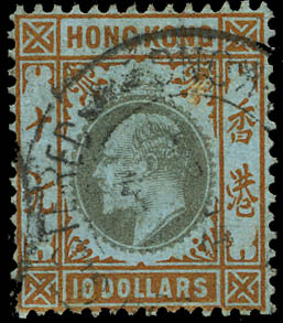 Hong Kong, 1903, King Edward VII, $10 slate & orange on blue, Crown CA watermark (SG 76. Scott 85). SG £500 ($640). Scott $450.