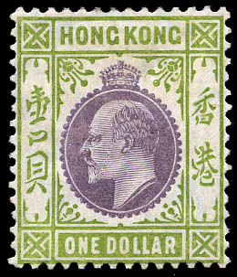 Hong Kong, 1906, King Edward VII, $1 purple & sage green, chalky paper, Multiple Crown CA watermark (SG 86a. Scott 103a), Fein. SG £180 ($230). Scott $160.
