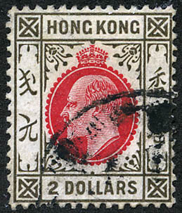 Hong Kong, 1910, King Edward VII, $2 carmine red & black, Multiple Crown CA watermark (SG 99. Scott 105), Pracht. SG £425 ($540). Scott $440.