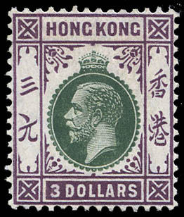 Hong Kong, 1912, King George V, $3 green & purple, Multiple Crown CA watermark (SG 114. Scott 122), Pracht. SG £300 ($380). Scott $250.
