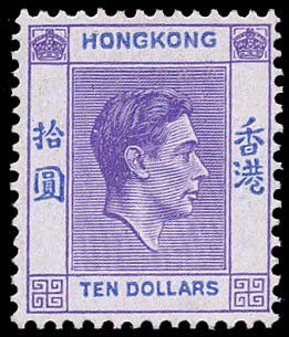 Hong Kong, 1947, King George VI, $10 reddish violet & blue, chalky paper (SG 162b. Scott 166A), Feinst. SG £200 for n.h. ($260). Scott $100 for hinged.