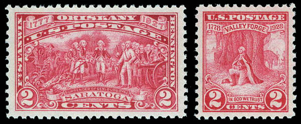 1927, 2¢ Burgoyne and 1928, 2¢ Valley Forge (Scott 644, 645), XF-SUP 95. SMQ $110.