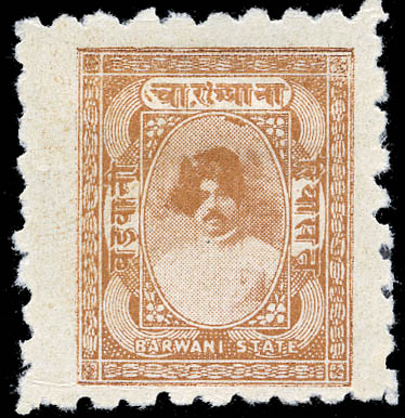 Indian States: Barwani, 1927-28, Rana Rajit Singh, 4a orange brown on thick paper (SG 23c. Scott 17), Feinst. SG £225 ($290). Scott $200.