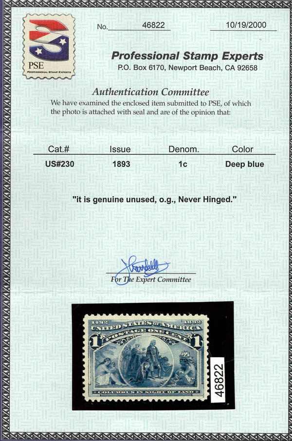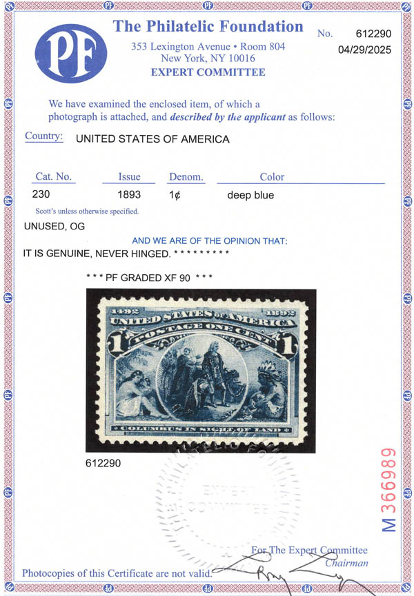 1893, 1¢ Columbian (Scott 230), XF 90. Scott $33. SMQ $100.