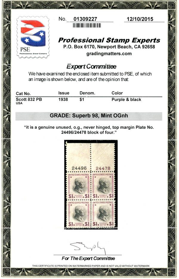 1938, $1 Wilson (Scott 832), SUP 98. SMQ $900 as 4 singles.