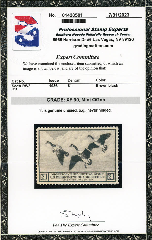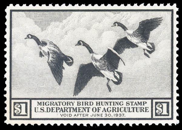 Federal Duck Stamp, 1936, $1 Canada Geese (Scott RW3), Kabinettstück. Scott $325. SMQ $500.