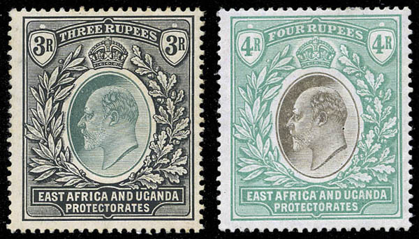 Los 306![]() Kenya, Uganda & Tanganyika: East Africa & Uganda, 1907, King Edward VII, 3r gray green & black and 4r gray & emerald green, Multiple Crown CA watermark (SG 28, 29. Scott 27, 28), Feinst. SG £280 ($360). Scott $240. Estimate $80 - 120. |