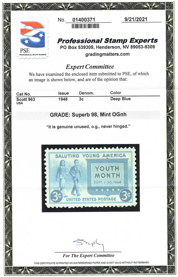 1948, 3¢ Salute to Youth (Scott 963), Luxus. SMQ $55.
