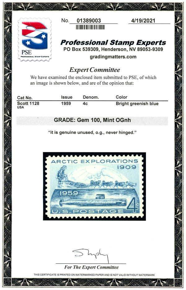 1959, 4¢ Arctic Explorations (Scott 1128), GEM 100. SMQ $170.