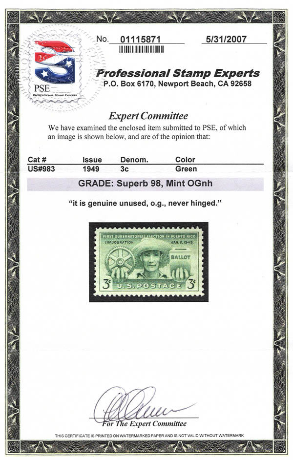 1949, 3¢ Puerto Rico Election (Scott 983), Luxus. SMQ $45.