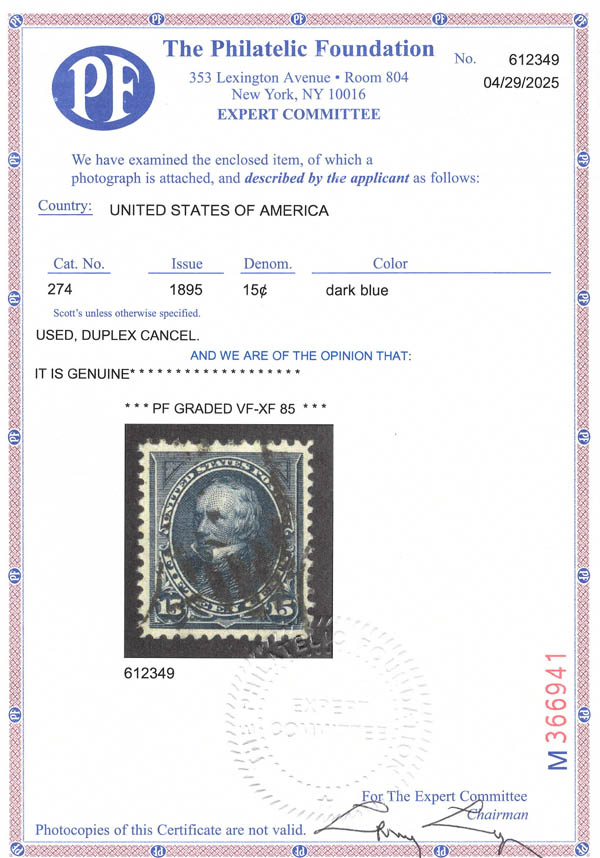 1895, 15¢ Clay, dark blue, D.L. watermark (Scott 274), VF-XF 85. SMQ $50.