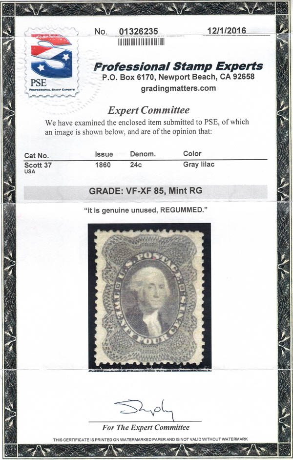 1860, 24¢ Washington, gray lilac (Scott 37), VF-XF 85. Scott $500. SMQ $700.